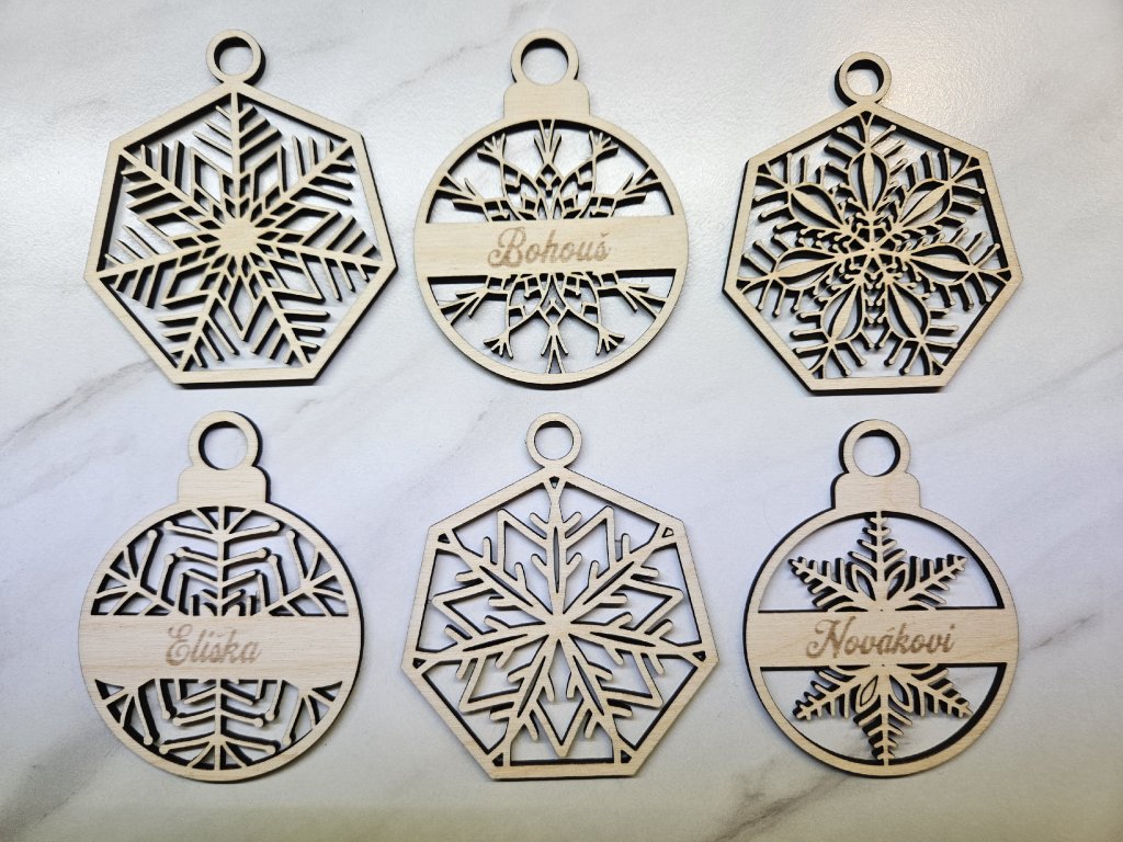 Sada vánočních ozdob s motivem sněhové vločky. Sada obsahuje 6ks, z nichž 3 je možné doplnit zakázkovým textem. Ozdoby jsou vyrobené z nelakované překližky o tloušťce 3mm.
