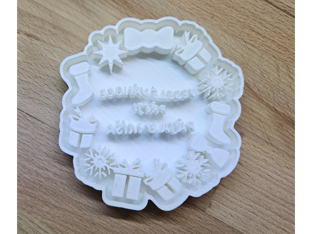 Vykrajovátko s Vánoční tematikou a textem "Veselé Vánoce přejí", který si můžete doplnit vlastním jménem/jmény. Text můžete upřesnit v poznámce k objednávce před objednáním. Vykrajovátka jsou vyrobena z materiálu PLA který je šetrný k přírodě a je certifikován pro styk s potravinami. Výrobek není možné čistit v myčce nádobí.